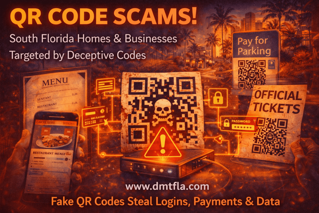 DMT IT & Cybersecurity Solutions helps South Florida businesses reduce QR-related risks through secure systems, user awareness, and monitoring. As a result, businesses protect customers while maintaining convenience.