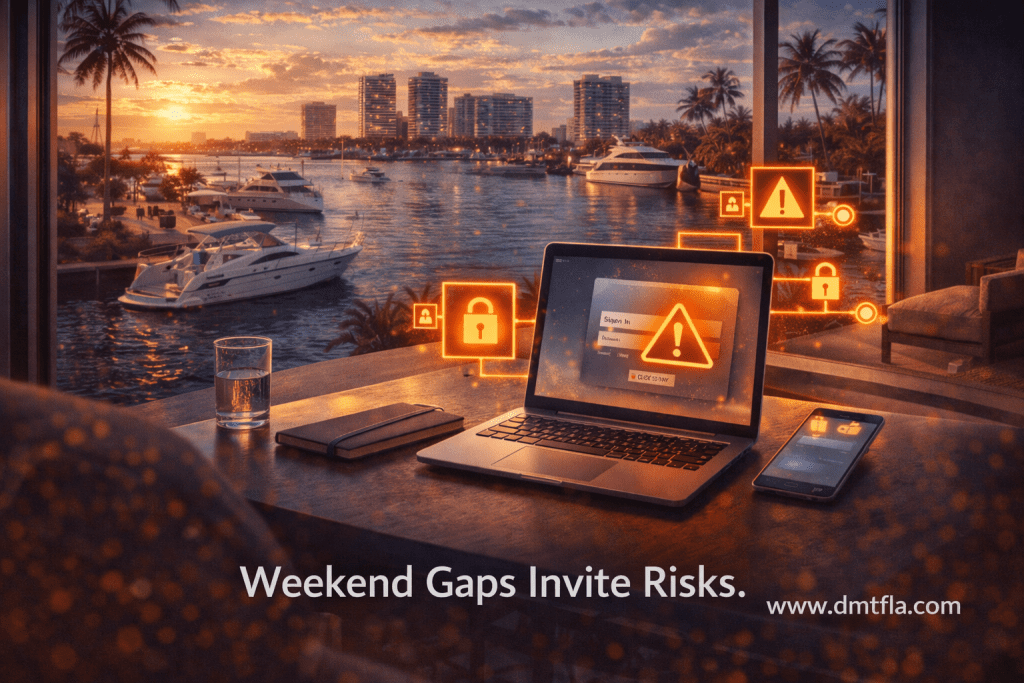 Weekend device security risks often go unnoticed across South Florida as businesses and households step away from daily routines. While people disconnect mentally, phones, laptops, tablets, and smart devices remain powered on and connected.